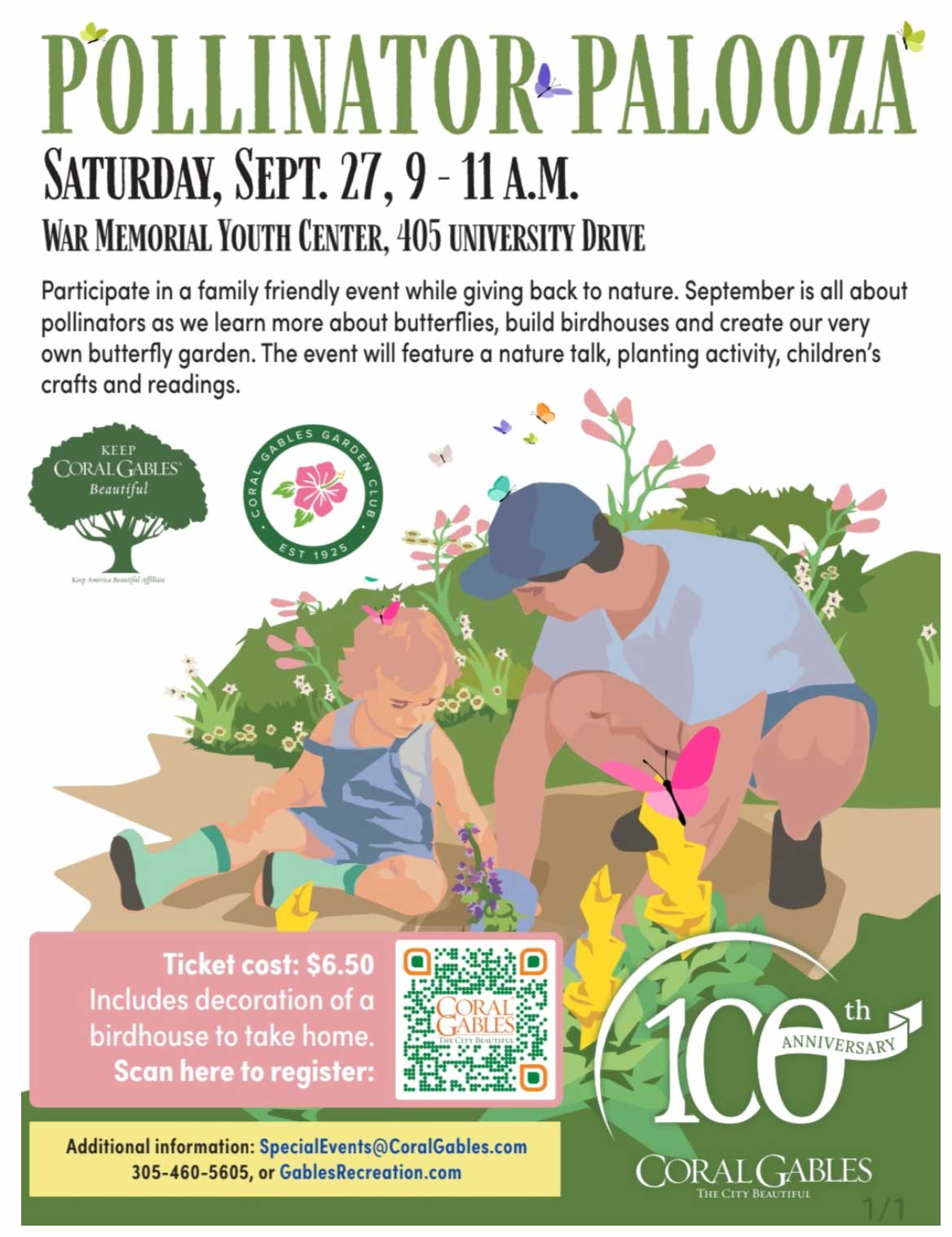 Help us Keep Coral Gables Beautiful by participating in a family-friendly planting event that focuses on providing pollinator gardens and patches throughout our city's parks and open spaces. This month's planting activity will take place at the War Memorial Youth Center, where participants will have the opportunity to restore a planting bed with native and pollinator plant species. Event includes children’s crafts and readings, planting activity, and an introduction to the iNaturalist app to track and record local pollinator species in our community and backyards.