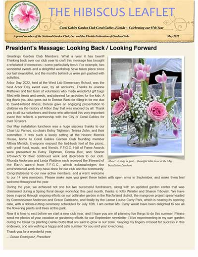 Past issues of the Hibiscus Leaflet PDFs are linked below. What a fun way to revisit and relive the past few years of activity and accomplishments. You will still receive our monthly newsletter via E-blast, artfully designed by Michele Dudley.