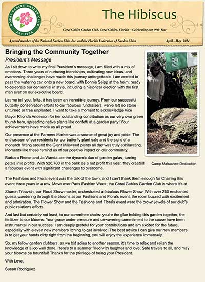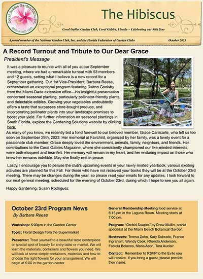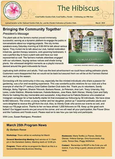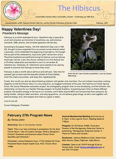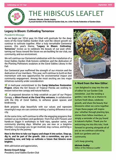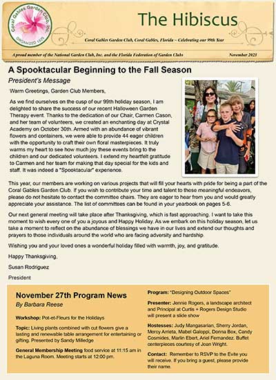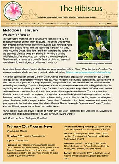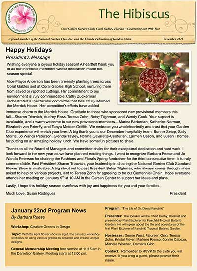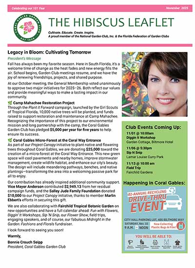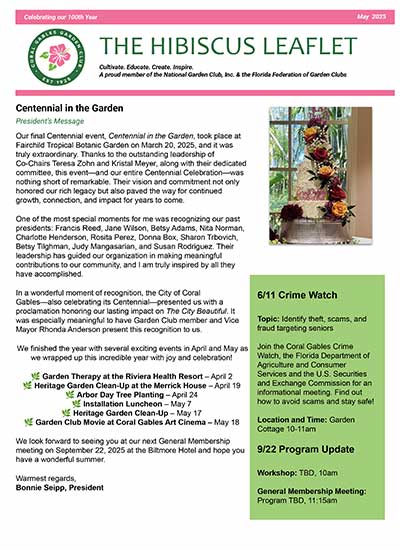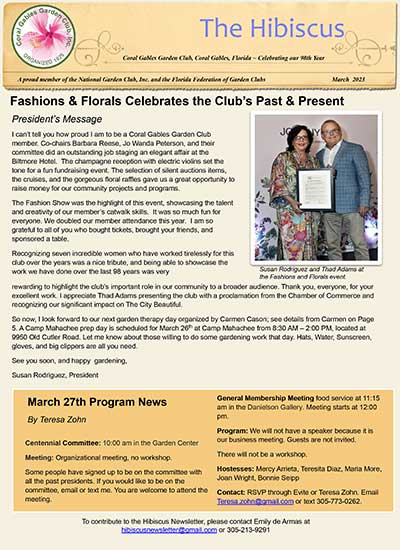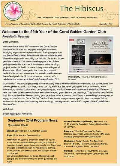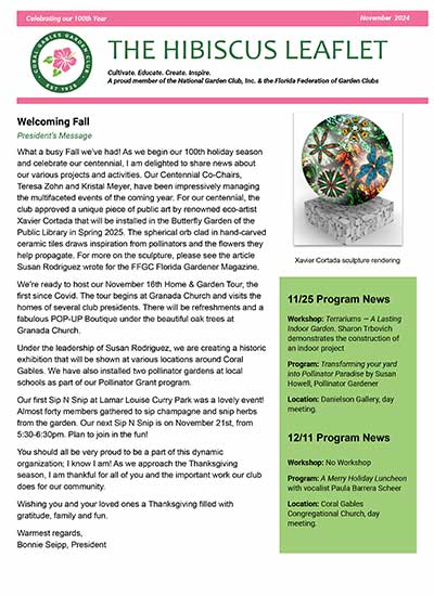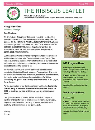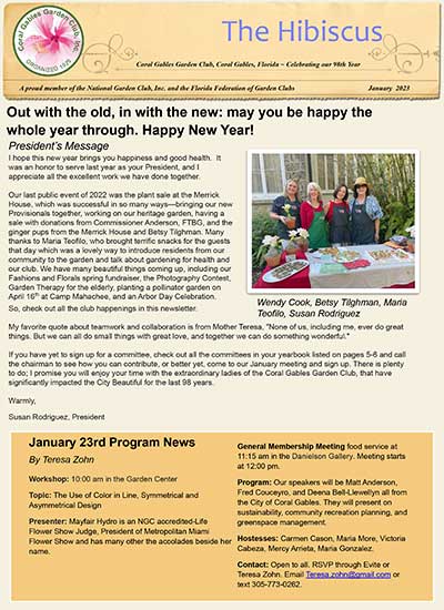 Past issues of the Hibiscus Leaflet PDFs are linked below. What a fun way to revisit and relive the past few years of activity and accomplishments. You will still receive our monthly newsletter via E-blast, artfully designed by Michele Dudley.